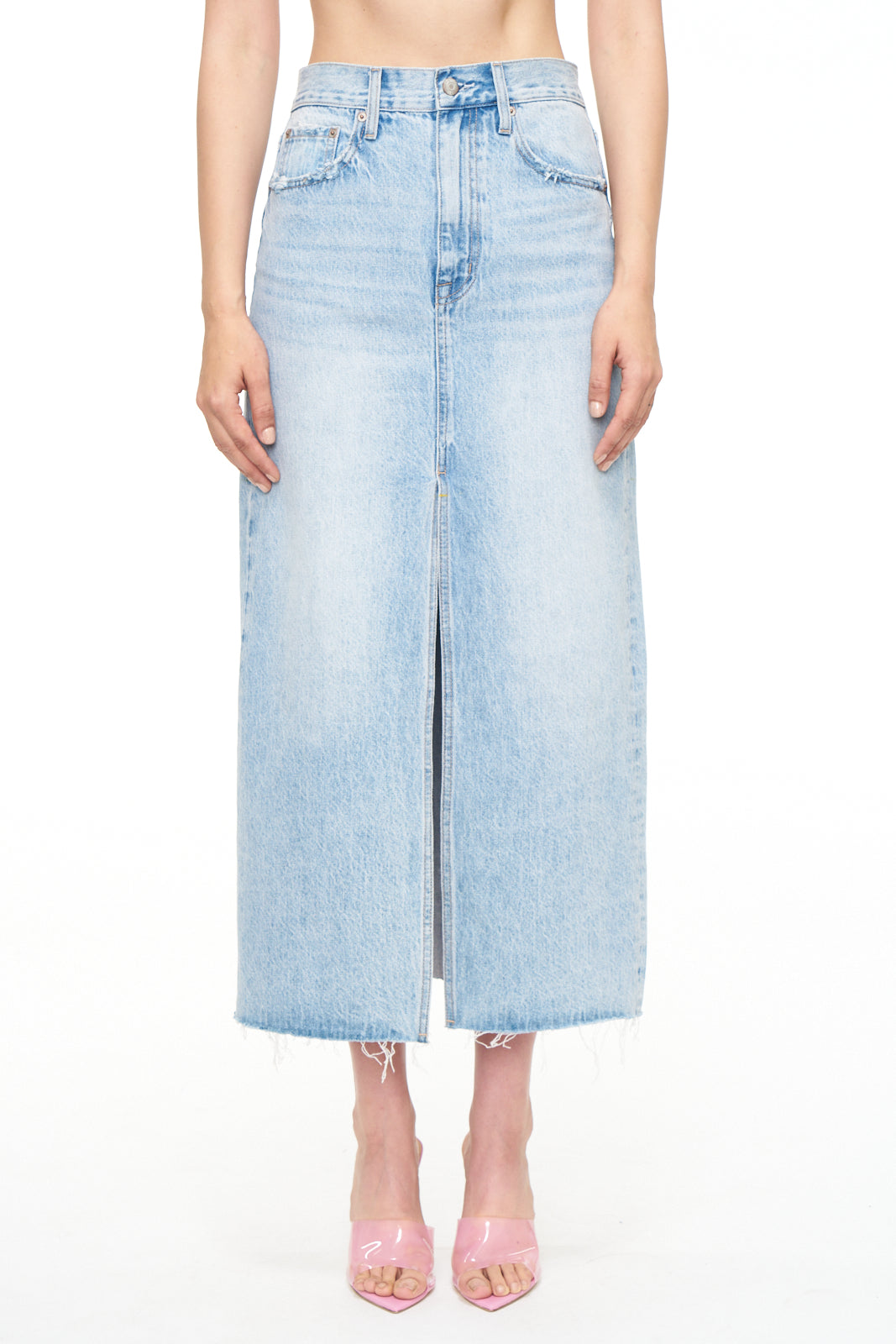 Sleek black faux leather midi skirt by Pistola featuring front slit and utility-inspired pockets