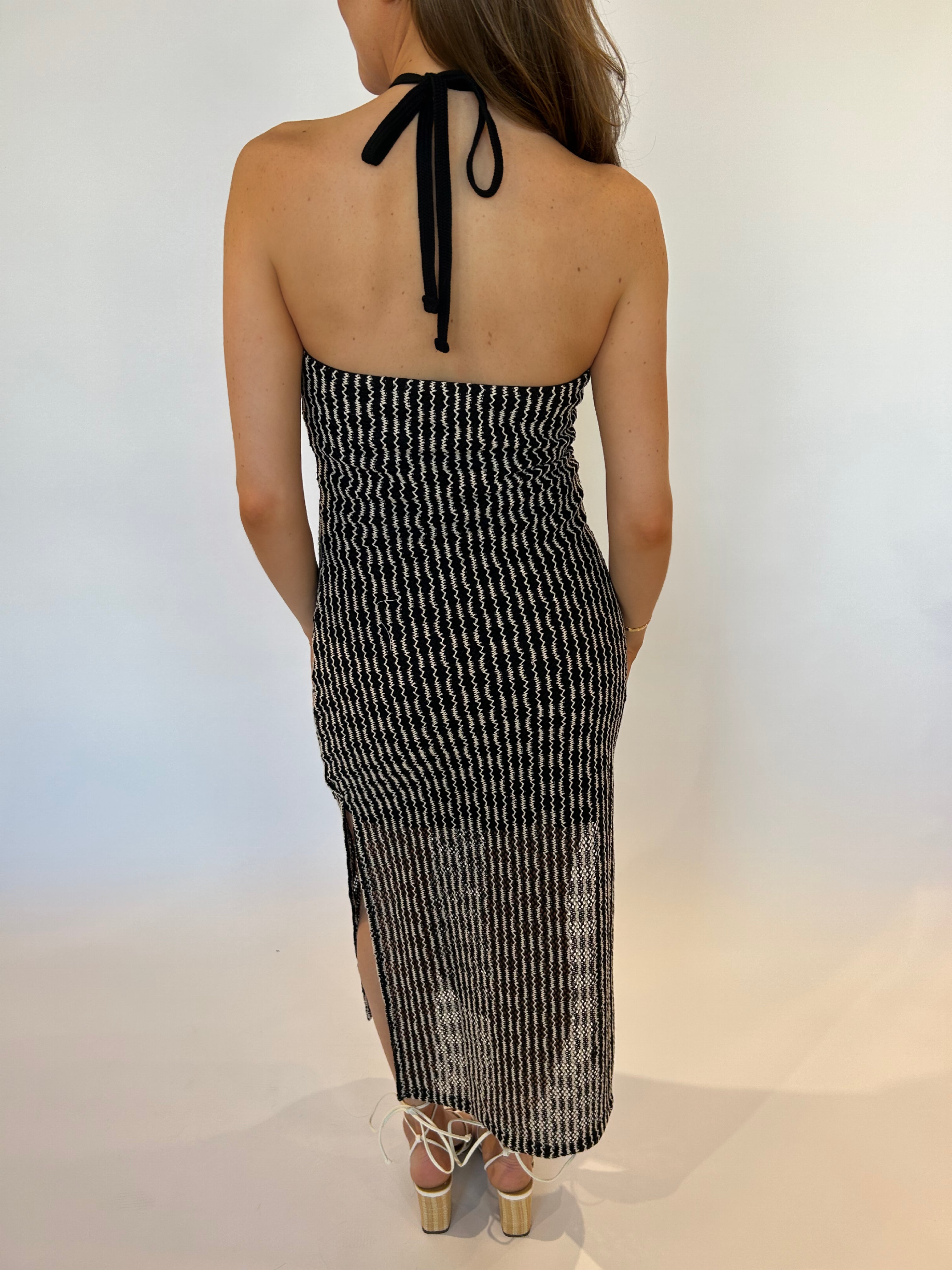 This halter midi dress is the perfect blend of elegance and allure. Featuring a lined top for structure and a sheer, flowy bottom with a daring slit up the side, it’s designed to turn heads wherever you go. Whether it’s a cocktail party, date night, or special occasion, this dress is your go-to for a look that’s effortlessly chic and unforgettable.