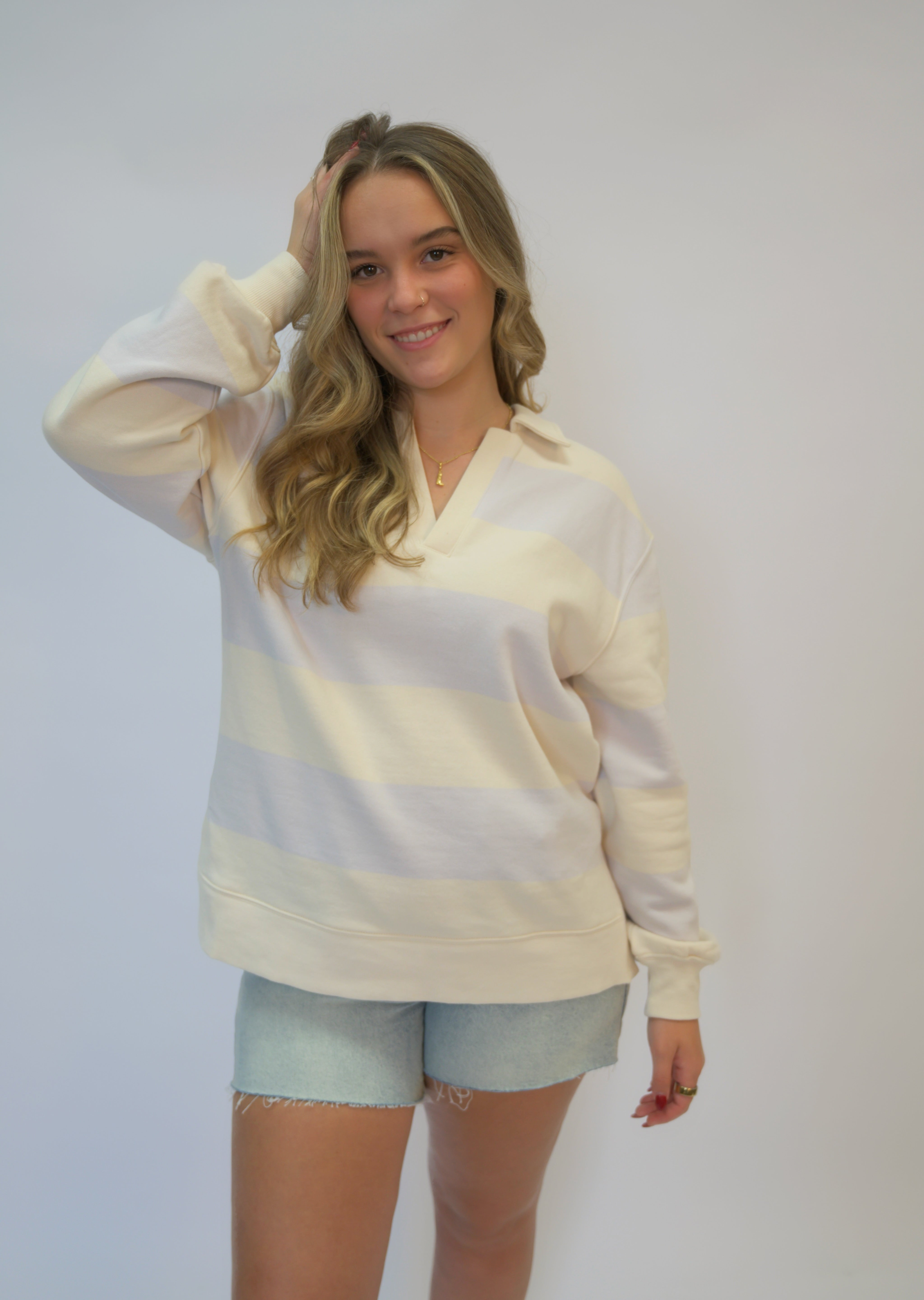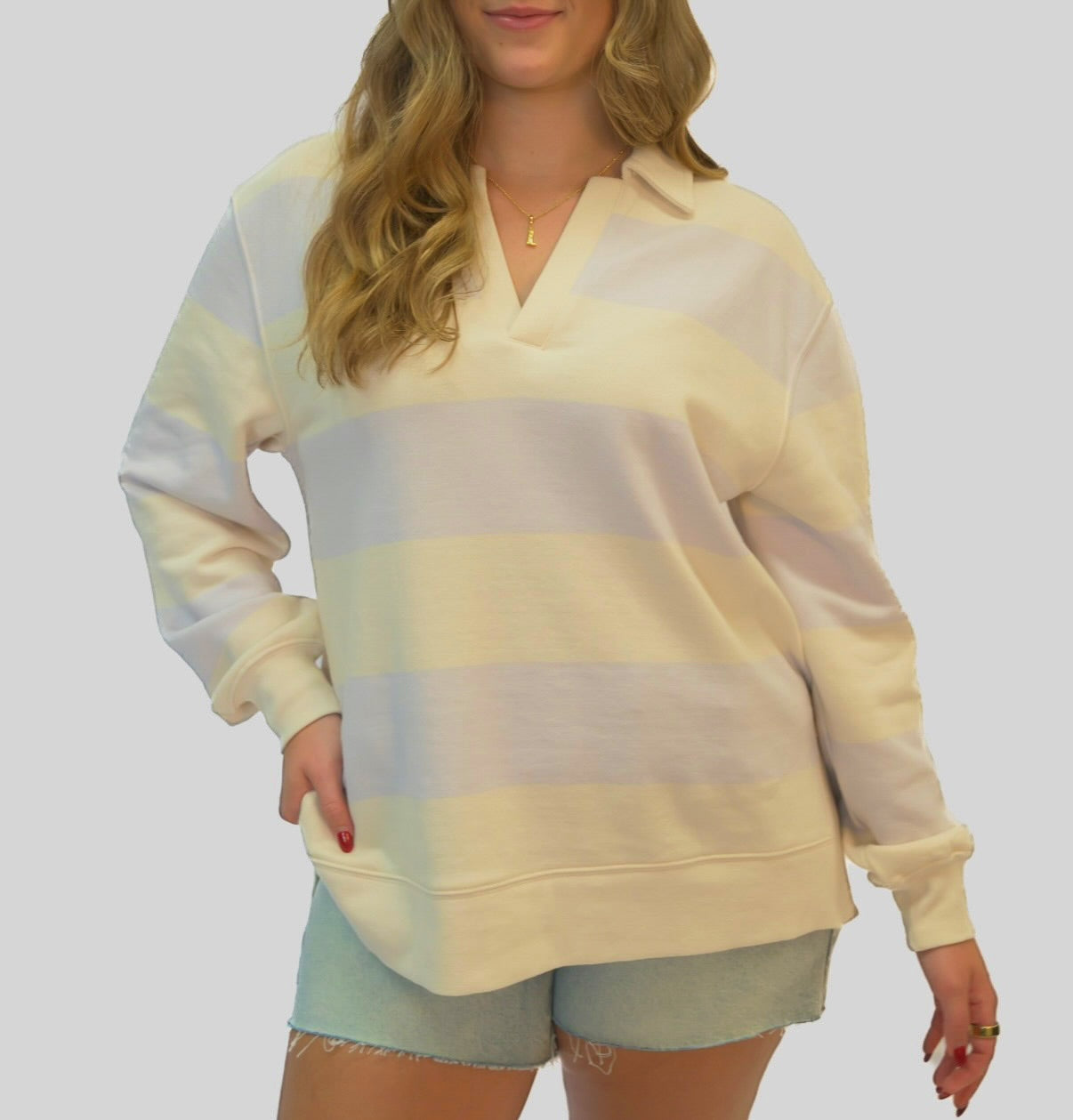 Channel effortless prep vibes in this oversized rugby henley — the ultimate cozy-chic layer for cooler afternoons and laid-back evenings. With its relaxed fit and sporty-cute style, it pairs perfectly with your fave jeans or keeps it comfy with sweats. Think off-duty, but make it fashion.